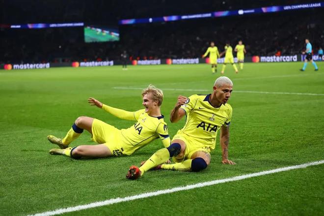 本场比赛进行到第34分钟,穆阿尼在禁区内传中,里沙利松头球破门,热刺客场1-0领先巴黎。第45分钟,18岁小将康坦-恩贾恩图在前场横传,维蒂尼亚抽射破门扳平比分,巴黎1-1热刺。