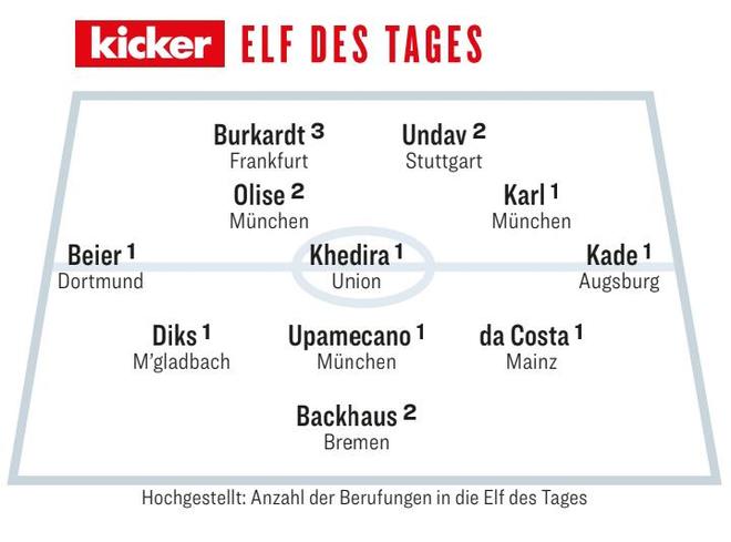 中场:拜尔(多特)、拉尼-赫迪拉(柏林联合)、安东-卡德(奥格斯堡)、奥利塞(拜仁)、伦纳特-卡尔(拜仁)