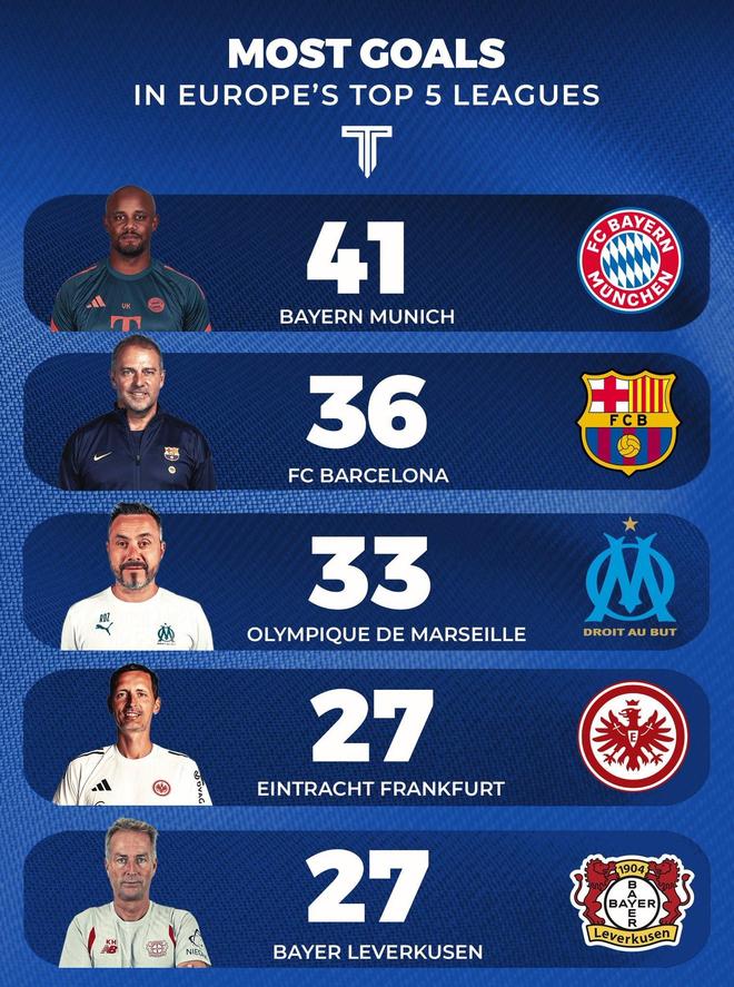 - 本赛季五大联赛俱乐部进球榜TOP5:拜仁11轮41球第1,巴萨第2